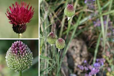 My front garden has the most colour at the moment. The photos below show my rose ‘Cardinal de Richelieu’ still holding on to a few flowers. Now though, my rose has the backdrop of the penstemon ‘Etna’ firing up the whole border with colour glowing up and through grasses and alongside the violet blues of the nepata ‘Walkers Low’. Pink asters are tucked into corners and my small buddleia is creeping up through grasses now too. New for this year were the beans which are growing well in the last photo of this group. You will also see two allium christophii heads – the small photo shows a seed head but as the other grows in a shadier part of my back garden is only now fully in flower.