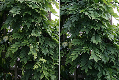 Whippy growth on the wisteria is usually pruned back throughout the summer but I have to say that I have noticed much less of this growth this year. I did prune some last week and will keep an eye on it for more. I think the photo also show how beautiful the layers of wisteria foliage are too – I love the way it drapes over my pergola.
