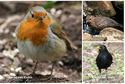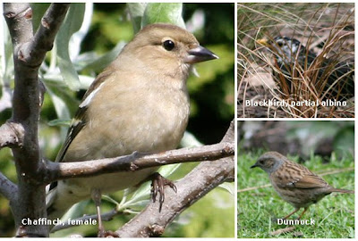 A Juvenile Blackbird closely followed the robin beside the pond. I have to say I didn’t expect to see one of these this morning – its back feathers had turned black but the front was still brown not unlike the photo below which was taken of another juvenile in May this year. Recently I have noticed the blackbirds return to running around the plants chasing each other. I had also noticed a few different partial albinos (blackbirds with white feathers – often on the head) and one did visit this morning. The photo below was taken earlier in the year – I would like to get some better photos to show the different patterns of white feathers on these birds. This morning I saw five Blackbirds.