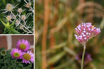 Photos above from top: Thistle flowers of Cirsium, coral trumpets of Penstemon, Sea Holly, pink Asters, Verbena Bonariensis, orange Osteospermum, pink crane’s bill geranium and white Borage.