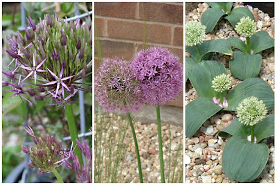 The opening flowers hold so much interest for me too as they all come into flower at slightly different times as you can see with Purple Sensation again in the main photo above. Perhaps as they have a gravel mulch the planting depth could vary and that is how I get this. The smaller photos show the bud of the Christophii and the Drumstick Allium and how it starts green and gets darker until it fully becomes a deep pink colour.