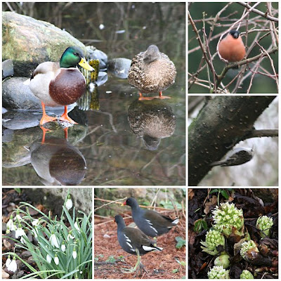 Time was not on my side now – I was soon to get picked up again. I did see some plants in flower. Snowdrops were seen in pockets and new plant growth was emerging through the winter mulches. I also spotted a pair of moorhens but they really didn’t stay still enough for still photos even with a tripod. Gosh what out of scale and ugly feet such a pretty bird has!