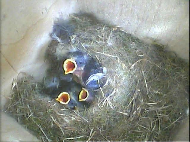 So as you can see now, our chicks now have blue feathers, yellow feathers, wings with wing bar markings, head markings, dots for eyes and the instinct to peck at bugs on themselves to remove them. They also know to keep their mouths open and try and get out of the nest/away from the other birds when it gets warm in the nestbox. Wow!!