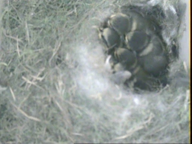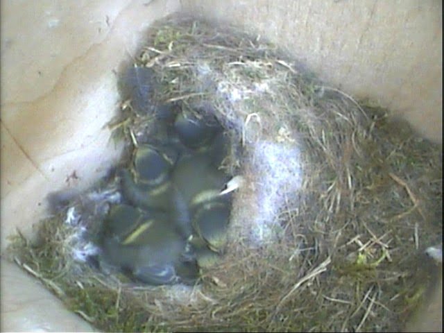 Have you spotted the difference? The chicks are seen very low in the nest now. Any guesses? Well, I heard a clatter through my PC speakers telling me something was on the roof of the nestbox. The chicks instinctively understood this was not a parent coming into the nestbox and therefore a threat and quickly hid. I watched them as they stayed perfectly still for almost 10 minutes.