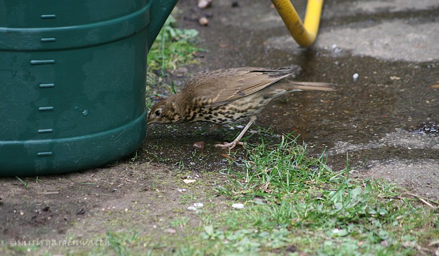 The image above shows a Song Thrush drinking the careless spill from my watering can. I can’t remember what I was dong this day back in April 2007. I’d take a guess my arms were a little tired after a session gardening and I had brought the hose over to refill it instead of carrying it from the tap.