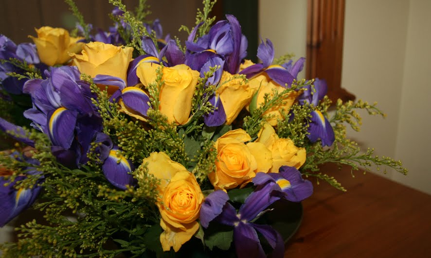 In celebration of five years of Garden Blogger’s Bloom Day I felt some colour was in order. Purple Iris with yellow Roses caught my eye in the supermarket yesterday and here we have (very quickly thrown together tonight) an arrangement at my front door that we can enjoy for the moment.