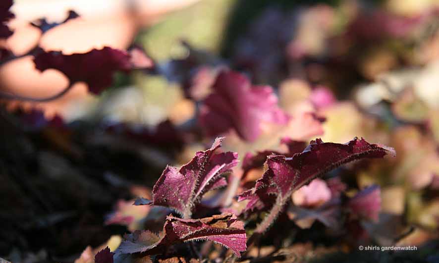 Back garden: Heucheras, catching the sunlight, wonderful foliage plant.