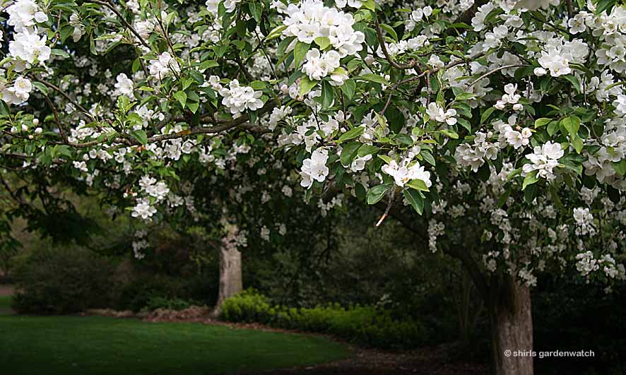 Next, it was the pond area that I was interested in and after just removing the winter protection from my Gunnera, I wondered how the large planting was looking here. Especially at this time of year, this plant looks so prehistoric! Stunning white blossom on trees to the right caught my eye first though. What a dreamy sight.