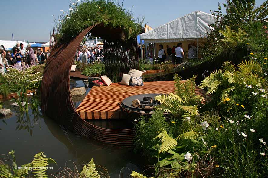 “Sam Lowndes of Water Gems formulated the intricate and sensitive design of the garden last autumn. It then took five months to prepare the four and a half tonne Rebar structure which had to be craned onto an articulated lorry and escorted to the showground by police outriders.”