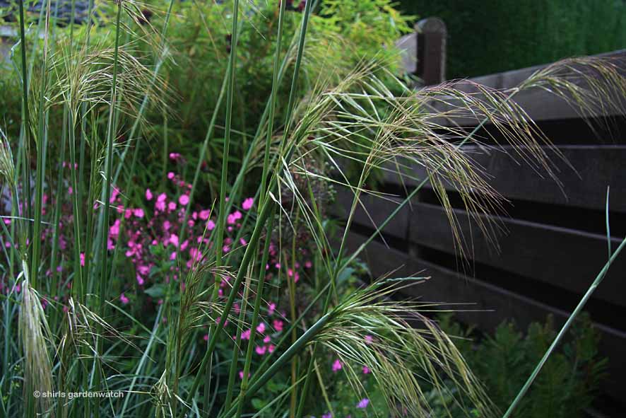 Come wind, rain or shine – you can’t hold back the growth on plants at the moment! In one month the garden has changed quite dramatically. Catching the late evening sun last night was the new golden oat-like flowers of the ornamental grass Stipa gigantea emerging from stems that are reaching for the sky. Some staking is required here at the base to support the stems on windy days.