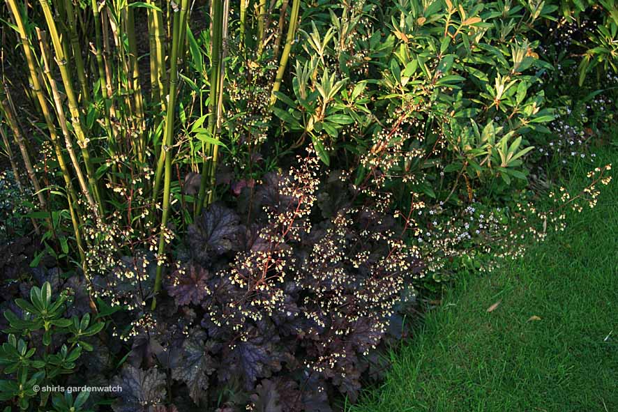 Hugging around the base of a golden stemmed Bamboo in my shadier back garden is a wonderful display of Heuchera fully in flower. These tiny flowers also attract bees which I am delighted about as I love this plant and keep dividing the ones I have to give greater carpets of ground cover which lasts throughout the year. This is the last spot to get the evening sun in my garden and it always makes me smile to see it.