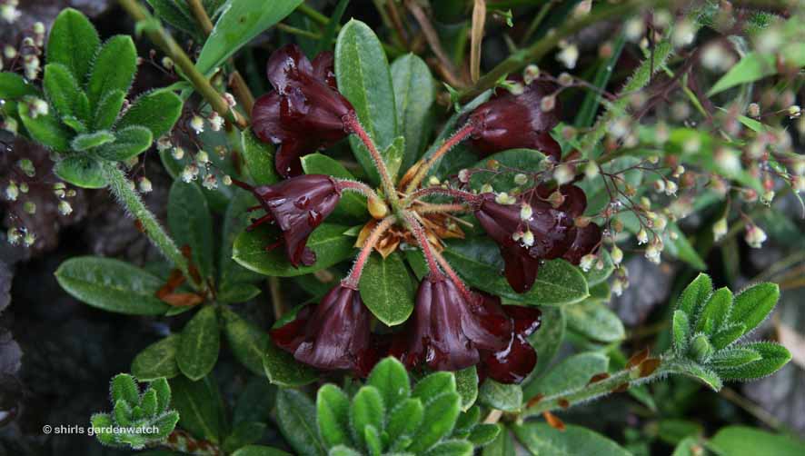 Fav flowers at the moment are red campion and heuchera. I love to watch the bees feeding on the tiny heuchera flowers and was thrilled to finally get a photo (see first montage). I’m loving the heuchera foliage just now. Oh… and there’s a special new rhododendron with its first flowers… Rh. SANGUINEUM spp DIDYMUM. I love it!