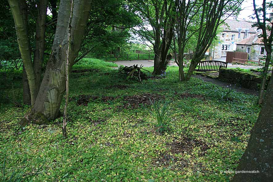 Taking a walk around the path to the left and looking back to the raised bed (back in March when it looked quite different) you can see the area in the middle of the photo between the trees that will get a bit of height and interest for both wildlife and visitors.