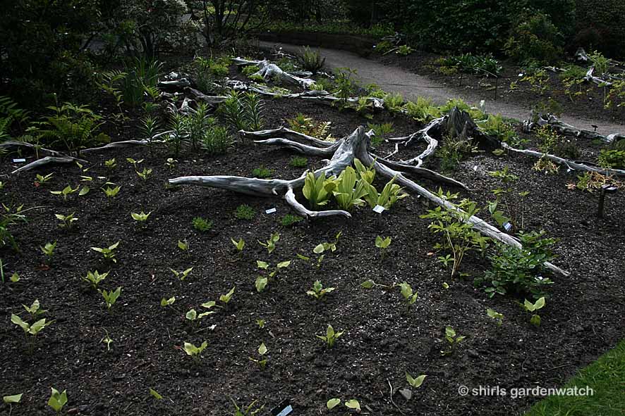 New borders in a garden always catch my eye. I love the excitement and expectation they bring. I also love to see new ideas and plantings too. I rather like this one at Edinburgh Botanics. I love the use of tree stumps and the plantings ranged from Ferns and Hostas to more exotic looking plants. The delicate Aquilegia blooms caught my eye.