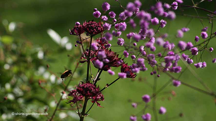 Another new introduction to this border from end of show display plant sales at Gardening Scotland this year are the dark astrantias. I reserved two plants from a display believing they were the same plant but as I see them grow in my garden now I am convinced they aren’t. I plan to mail images to the nursery to ask them. I thought I had bought Astrantia ‘Gill Richardson’ but found labels for ‘Ruby Wedding’ deep in the pots when I planted them. Bee en route to feed below – I’m en route to collect some seed after they’ve finished 🙂