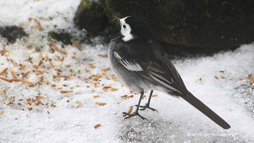 Ah… I had plenty of mealworms in my shed (lol – a Mother’s day gift) so I crushed some down a bit (knowing Starlings and Blackbirds would run away with them otherwise) and put them in the area near the feeder trays where the Pied Wagtail was first seen. I guess the Pied Wagtail was just looking after its find when it was chasing the Chaffinches.