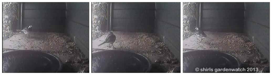 The ‘Starling tactics’ I employed for the Pied Wagtail this morning was much easier. I made a lose trail of crushed mealworms and breadcrumbs towards Hedgehog Manor and sprinkled a generous supply in there together with a fresh dish of water. It didn’t take too long for the Blackbirds to find this food as they already knew this as a source (I feed hedgehogs here). It wasn’t too long after that and the Pied Wagtail was seen on camera – although it was a tad nervous of coming inside at first.