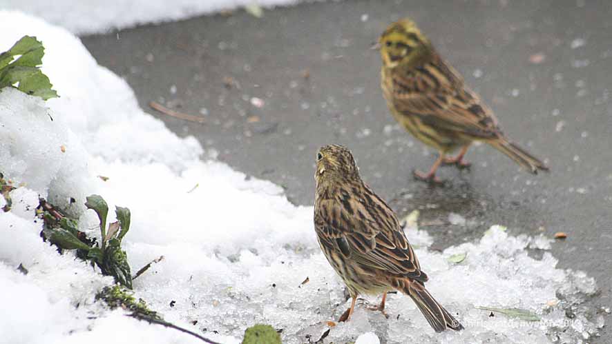 There was a bit more harmony in my wind chilled garden today, it was lovely to see a female Brambling feed at the pond area too (photos another time). Towards the end of the afternoon, when the garden was fairly quiet, I’m delighted to report that a group of Yellowhammers landed on my still snow covered lawn. I didn’t see them at feeders, nor did I see where the Pied Wagtail was at the time. Hopefully they will return although my problem then will be stopping taking more photos and video of this very pretty bird that I know will be gone when the snow goes.