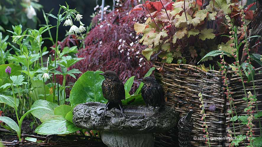 We’ve had a bit of a dry spell in the garden which has been great for getting stuff done and enjoying eating outside with the odd barbecue. However, I missed noticing the birdbaths had run dry and no sooner were they filled up and the birds were squabbling over them. However, the two juvenile Blackbirds that caught my camera yesterday seemed very mature and civilized as they waited to take turns in bathing.