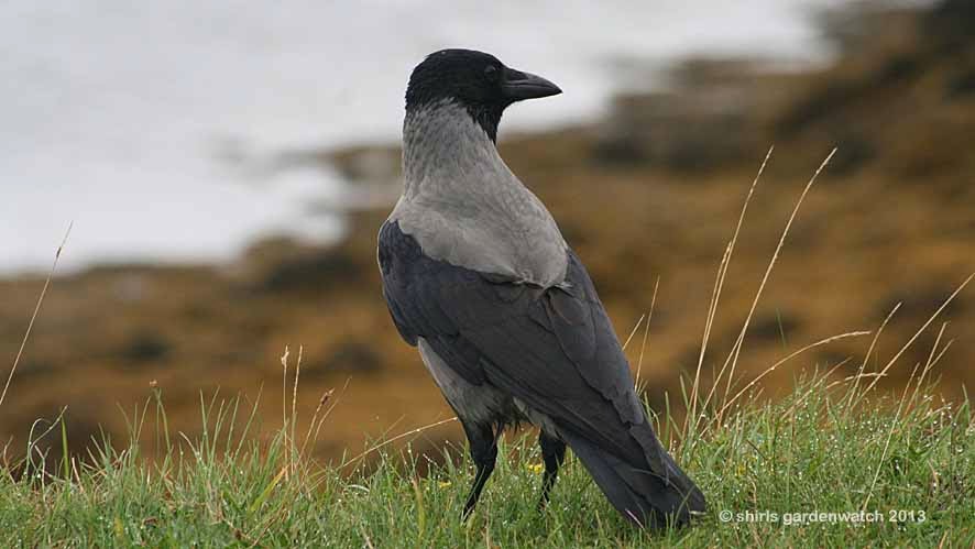 “The hooded crow, or ‘hoodie’ is now recognised as a different species to the carrion crow (Corvus corone). Both are around the same shape and size as a rook (Corvus frugilegus), but the hooded crow is easily identified by its two-colour plumage; the body is a dirty grey, while the wings, tail, head and bib are black. The calls are harsh and croaky, and include a ‘kra-kra-kra’, which may have given rise to the imitative name ‘crow’.”