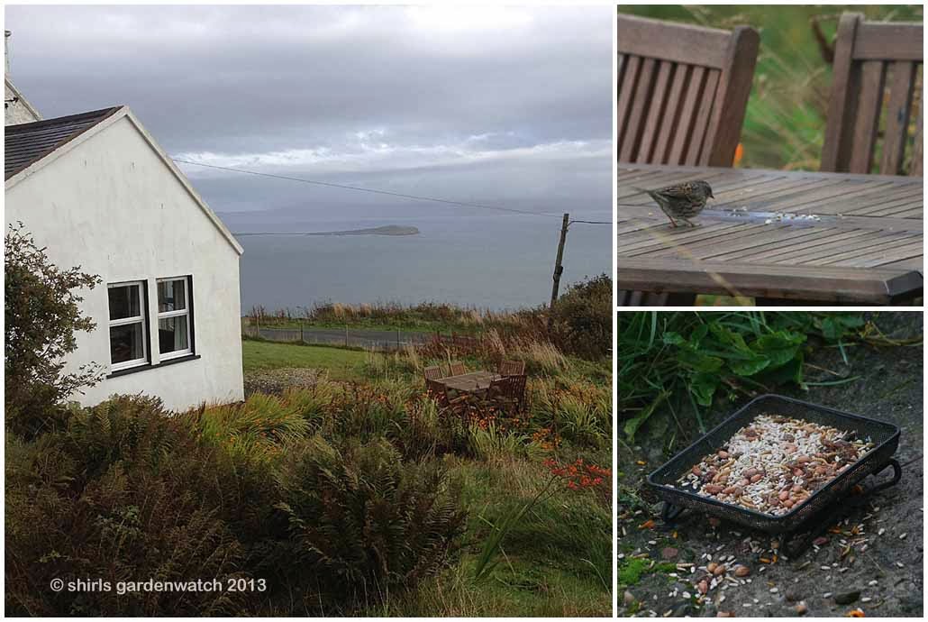 To tempt birds to my small ground feeder on Skye, I tried throwing bread bits en route to the feeder with the theory that it would be more visible from above – especially with the contrast of colour on the grass. Of course, as you might expect, the hooded crows watched from their vantage spot on the powerlines and didn’t come down when I was gardenwatching from my holiday cottage window. So… no photos there.
