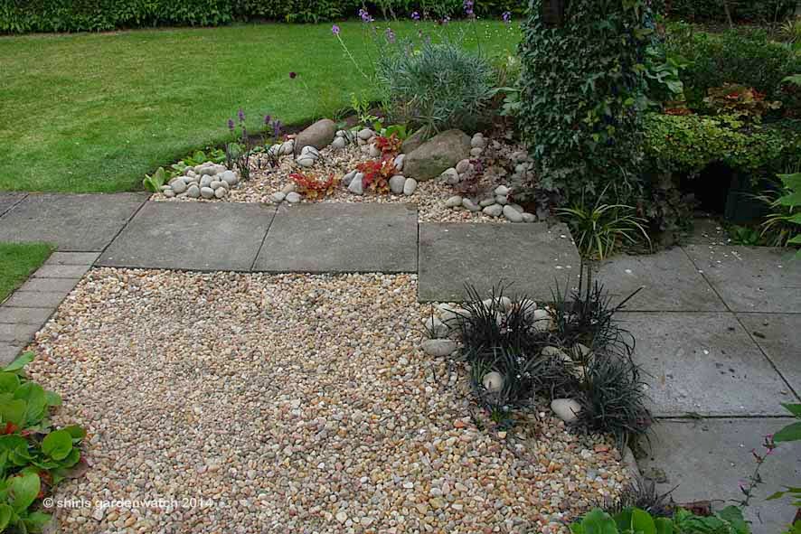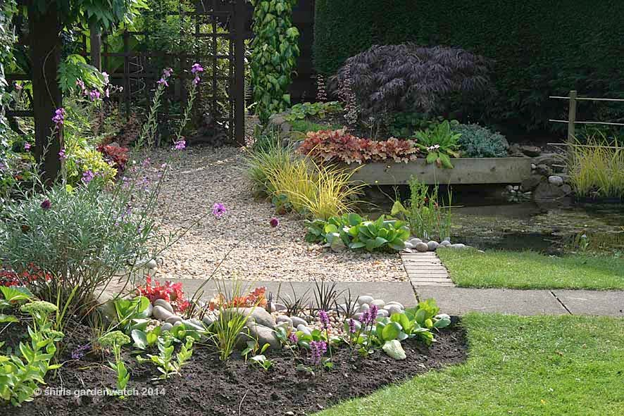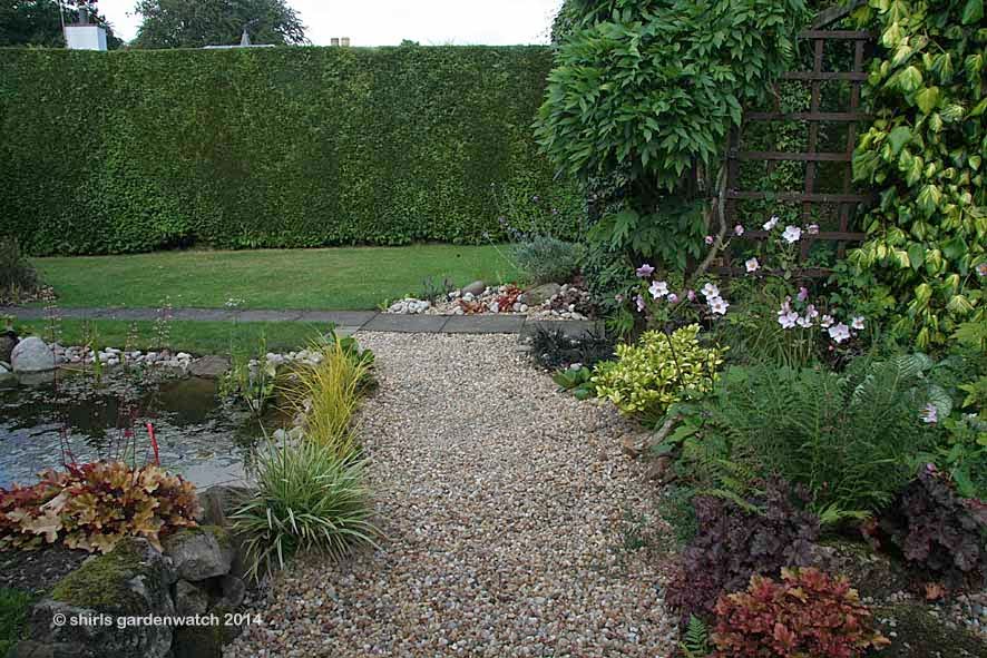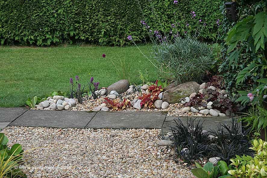 For a good few years now, I have gardened by carrying colours and plantings over and through neighbouring borders. I have a small garden and this way everything is connected and my garden space feels bigger. Now the pebbles have connected my wildlife pond to the garden borders 🙂
