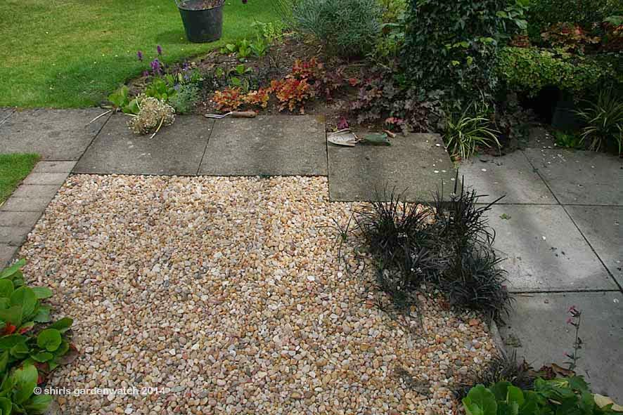 Three rocks no longer in use after other small garden changes were available to complete the retaining gravel wall. Placing the pebbles took a few attempts and I suspect I will change them yet. As the pebbles get covered with plant growth I’ll move some into the pond as I choose the same smooth ones in there. Rocks and stone, in this case pebbles, never go as far as you think they will. The pile on the path below is the contents of one bag.