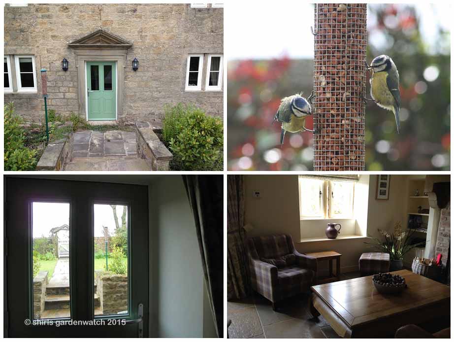 The peanut feeder pole can be seen to the left of the door, it was pushed in the ground away from roots of plants and outside weed suppressing fabric membrane. I was conscious of being respectful to the cottage owner and would never have taken a mixed seed feeder or fat balls as food spillage to the ground had the potential of germinating and leaving weeds.