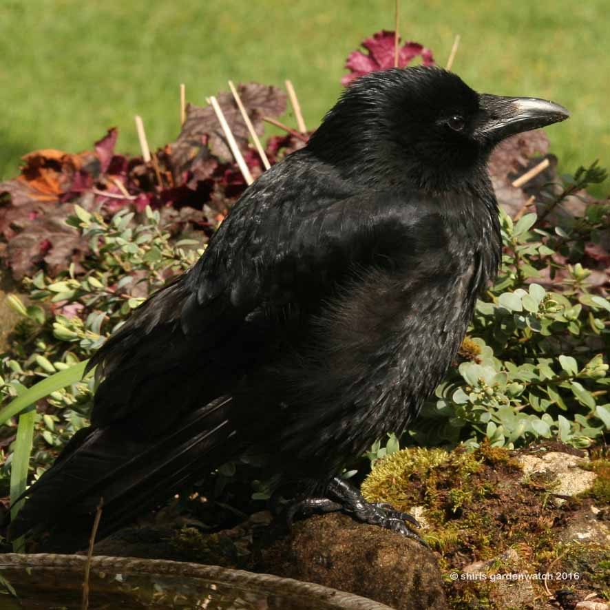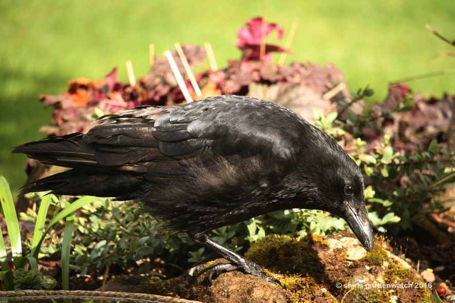 All week (National Gardening Week here in the UK) there has been a lonely carrion crow wandering around the garden, looking quite lost. By its behaviour of pecking at things (as if to test if edible) I might have guessed it to be a juvenile but it isn’t showing the yellow or red gape to support that. I should have considered that before asking Dave Culley on twitter last night. Thanks Dave! Btw Dave is currently filming a Tawny owl nest box with chicks in his garden and posting updates on his twitter page – fantastic to see, Dave 🙂