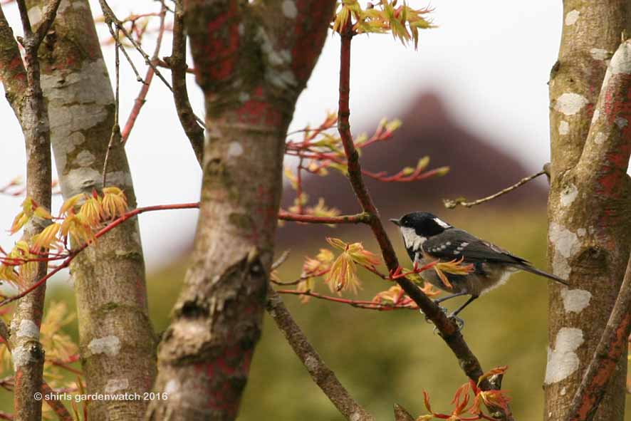 Coal tits are the entertainers of any garden they visit with their speed and skilled flying, feeding upside down and at varying angles too. Tiny as they are they, they were being spotted feeding, at all angles along the branches of my coral barked Acer with its unfurling, fresh new leaves on the Saturday and I never thought anything of it.
