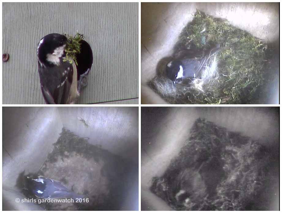 A video screen grab below shows how big the beakfuls of moss were on Sunday afternoon! Going anticlockwise through the images, the nestbox as we viewed it first and the Coal tit roosting in a very full box of moss at the end of Sunday. Yesterday saw more material go in and the bird roosting again. The final picture shows the view this morning with the fine hair and soft material going in!