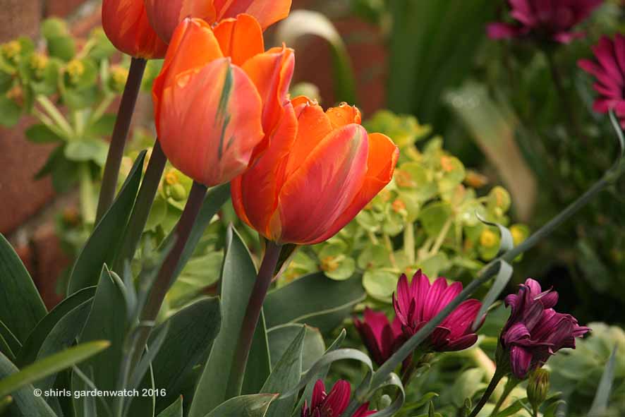 After yesterday’s post about orange flowers, it should be no surprise that last month I had the beautiful, orange tulip, ‘Princess Irene’ making a splash along with another newbie, the myrtle spurge (Euphorbia myrsinites) with its wonderful trailing lime green blooms in my planters.