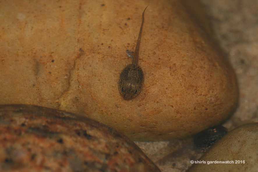 The pond water is currently clear enough for the tadpoles to be seen but there’s enough cover with plants and large pebbles to keep them safe too. The pebbles are working very well by our observations.