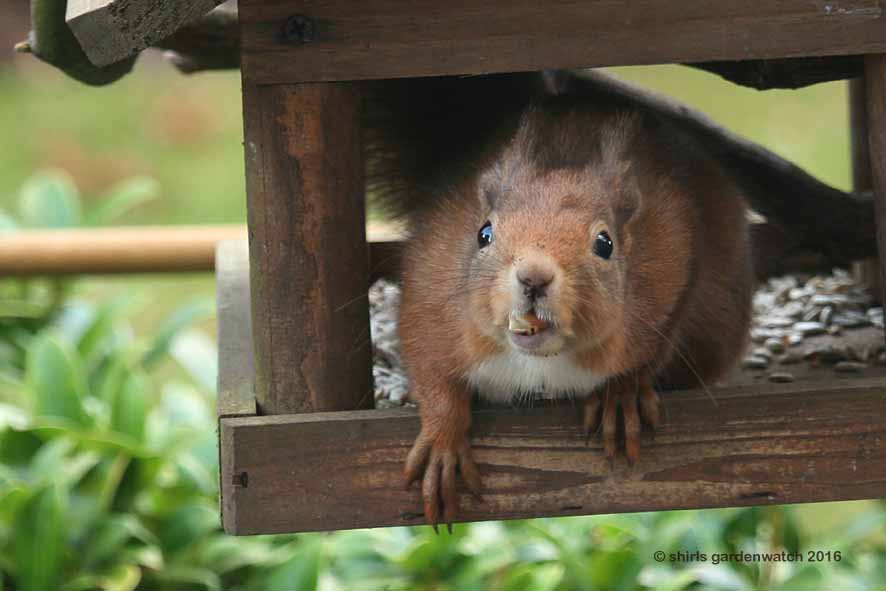 Sorry, Red squirrel, even if you do make it into the squirrel feeder later you need to take a step back (or run and a jump in your case) and give other garden wildlife a chance to shine today. Yes, you gave me your most funny face yet, yesterday. I know. I got photos too. You watched me take them. Perhaps if you had drunk out of the small pond waterfall trickle when I was inside at my window, where the camera was, instead of creeping up behind me when I was a few feet away making it easier for you to access your feeder… just saying 😉