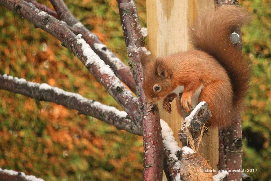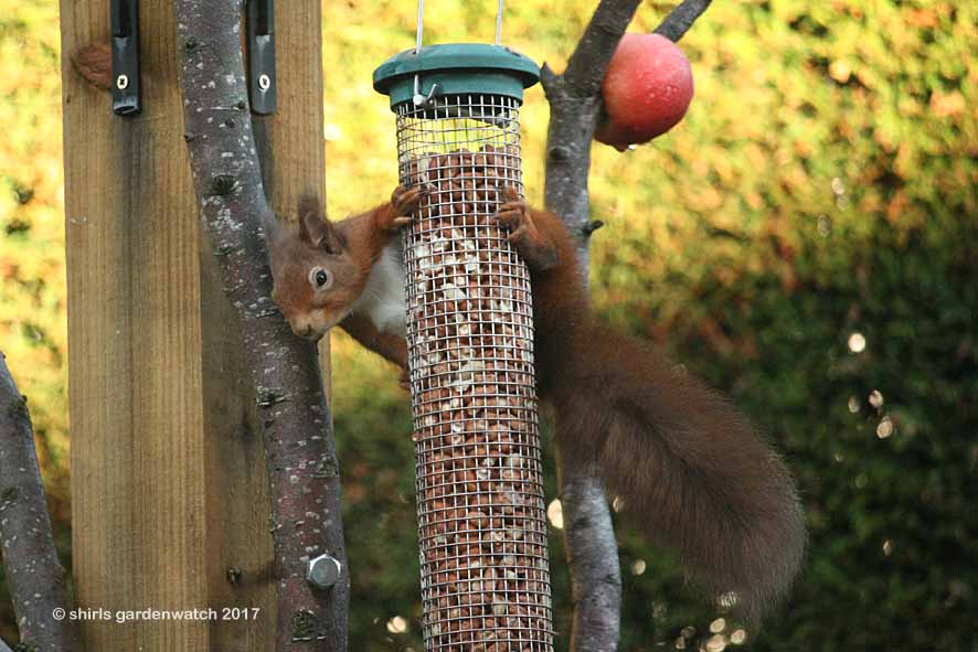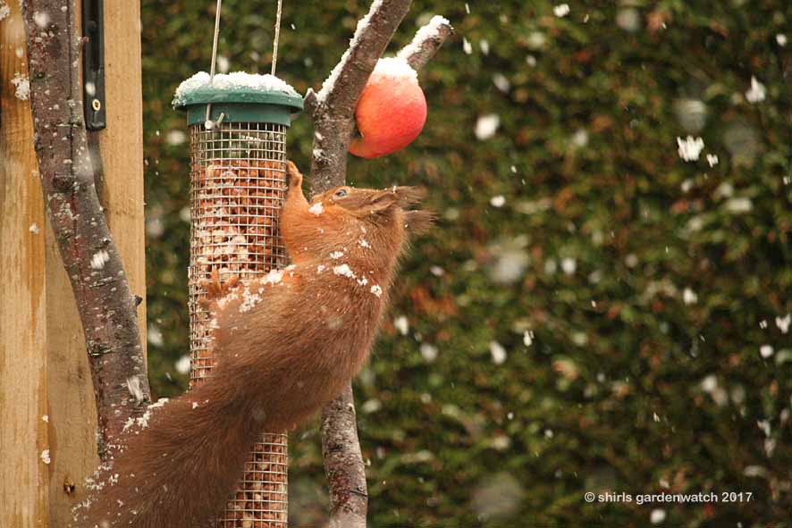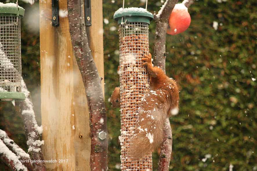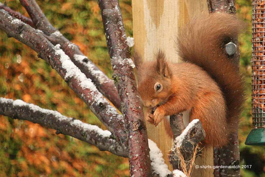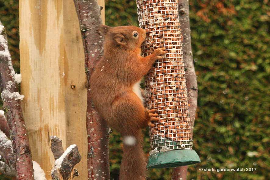For the past three, very different weather wise, lunchtimes I have been so very, very lucky to be at home, sipping homemade soup by my gardenwatch window to see a red squirrel feeding at our garden peanut feeder! What a delightful lunch companion it has been too 🙂